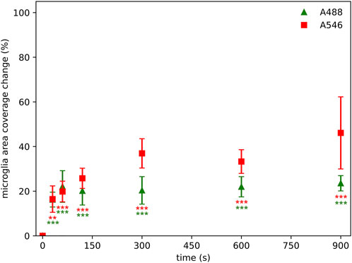 The relative microglial cell profile area coverage measurement maps the background density and standard deviation of the background to provide a cut-off value of the image of interest for segmentation. The same area at different time points was segmented and the relative differences between the actual image and the initial image was calculated. Notable changes occurred already after 60 s of illumination (Figure 4). Even after such a brief illumination, approximately 55% changes in the relative area occupied by microglia were observed regardless of the fluorophores. This change scaled up to a 90% loss after 300 s of illumination regardless of the fluorophore.