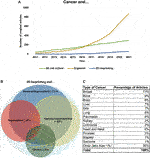 The number and distribution of cancer research papers regarding 3D bioprinting. (A) The number of research papers between 2011 and 2021 mentioning cancer models combined with 2D cell culture/organoid/3D bioprinting. The data show that the number of publications using 2D cell culture models is stagnating. Additionally, the organoid research area has increased faster for the last years and 3D bioprinted model systems have just been developing, but the application of 3D bioprinting technologies would also be increased rapidly in the future. (B) Original research papers which mention 3D bioprinting in relation with different scientific disciplines (>2260) mainly focused on 1. creating bone/cartilage and scaffold, 2. regeneration, 3. applications in the creation of vascular/cardio/skin/liver tissues/mini-organs and 4. cancer research. The distribution and the areas of the frontiers are also shown by Venn-diagram, the size of different circles represents the percentages of publications excluding review papers. (C) The distribution of cancer types among cancer research-related non-review and experimental papers (we excluded the papers where cancer research was only mentioned as a potential other research area or where 3D bioprinting was highlighted among technologies that are spreading or could help develop). Tumour types where the percentages of publications could not be higher than 1% merged into other studied malignancies groups.