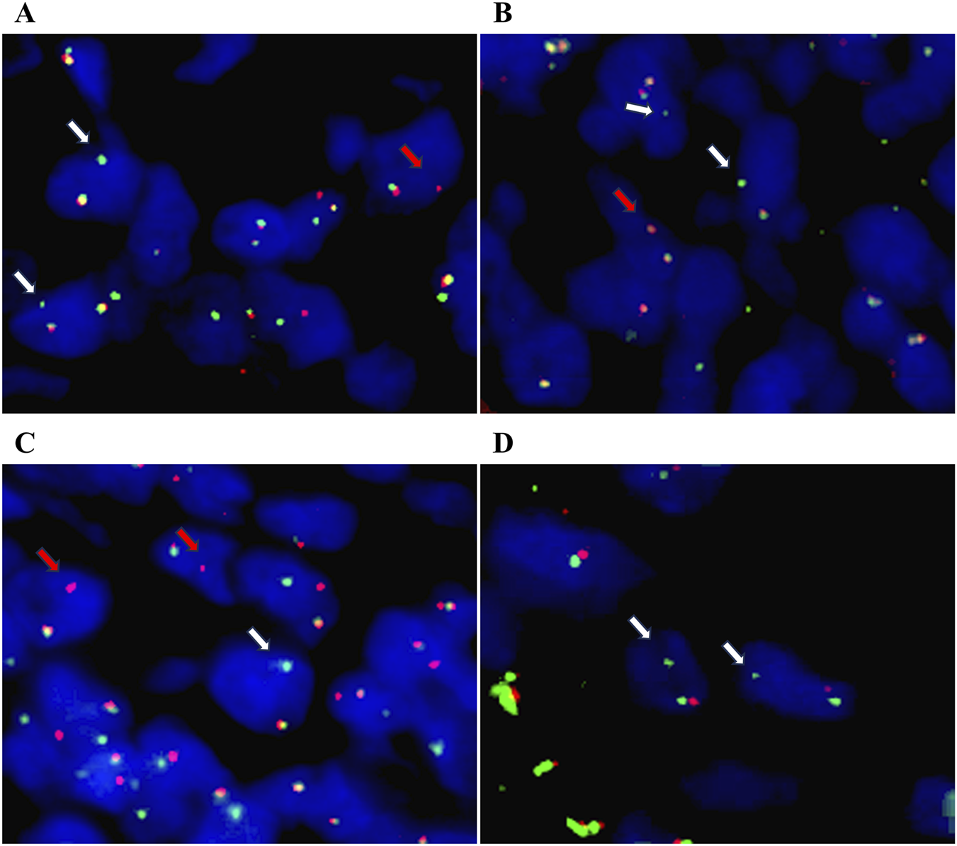 Atypical isolated signals detected by BCL2, MYC, BCL6, and DDIT3 FISH break-apart probes. (A) Isolated 3'/5′signals in BCL2 FISH break-apart probe (white arrow: isolated 3′signal; red arrow: isolated 5′signal). (B) Isolated 3'/5′signals in MYC FISH break-apart probe (white arrow: isolated 3′signal; red arrow: isolated 5′signal). (C) Isolated 3'/5′signals in BCL6 FISH break-apart probe (white arrow: isolated 3′signal; red arrow: isolated 5′signal). (D) Isolated 3′signals in DDIT3 FISH break-apart probe (white arrow). Original magnification: ×800.