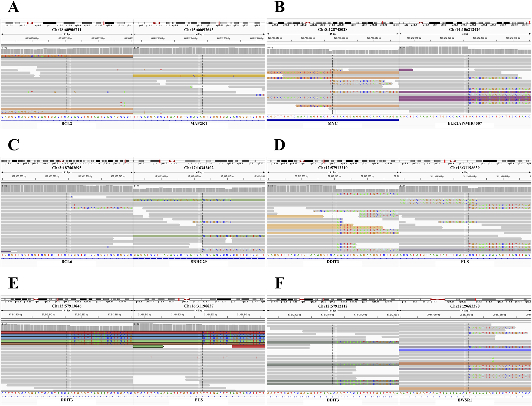 Translocations in isolated signals of BCL2, MYC, BCL6, and DDIT3. (A)BCL2 and MAP2K1 fusion in isolated 3'/5′BCL2 signals, visualized by Integrative Genomics Viewer (IGV). (B)MYC and ELK2AP/MIR4507 fusion in the isolated 3'/5′MYC signals, visualized by IGV. (C)BCL6 and SNHG29 fusion in isolated 3'/5′BCL6 signals, IGV visualization. (D,E)FUS-DDIT3 fusion detected in isolated 3′DDIT3 signals, visualized by IGV. (F)DDIT3 and EWSR1 fusion in isolated 3′DDIT3 signals, IGV visualization.