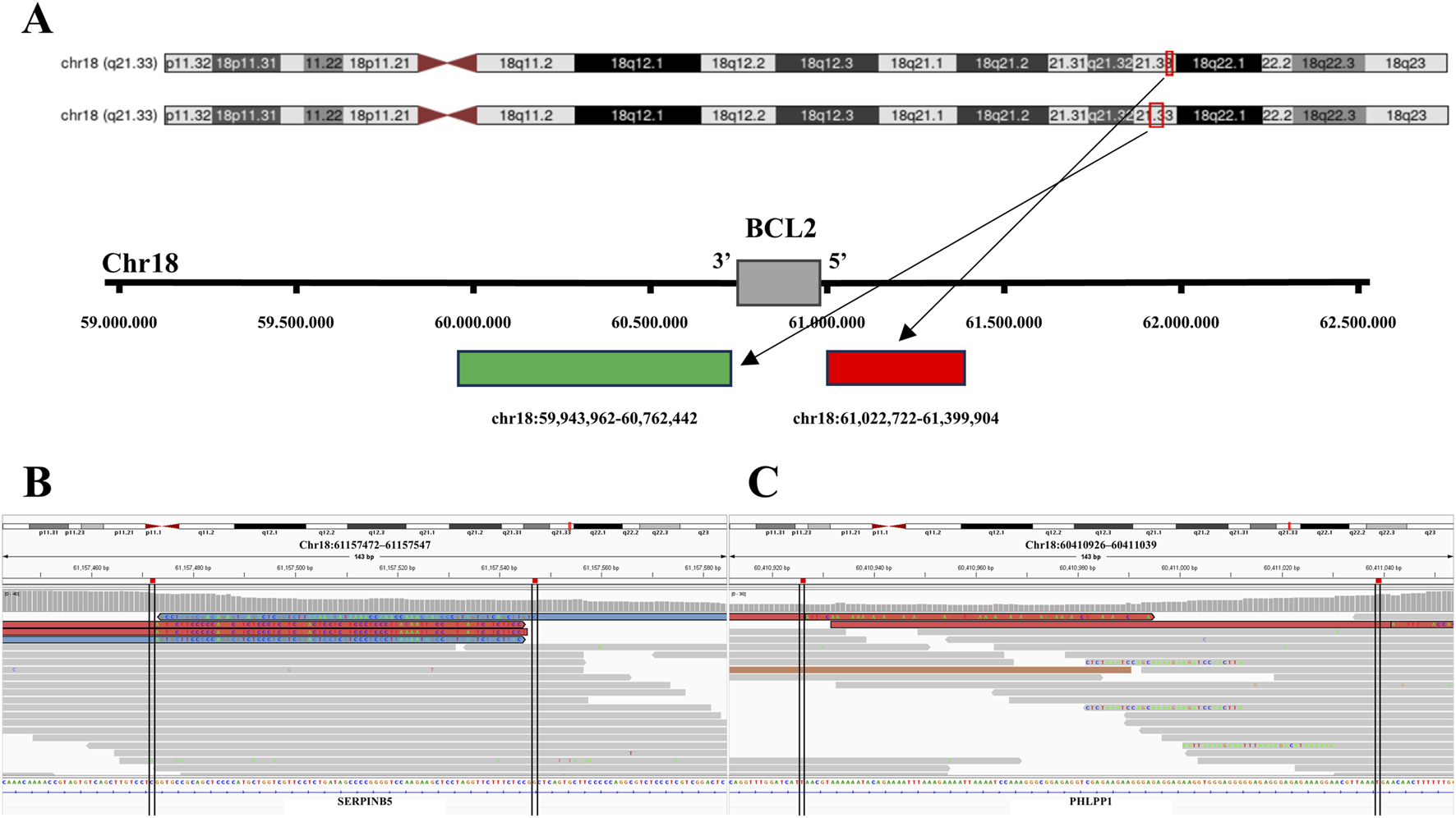 Deletions and inversions in the probe-binding regions of the tumor with BCL2 isolated signals. (A) Tile coordinates of the BCL2 FISH break-apart probe mapped onto the hg19 genome. The red region, indicated by the arrow, depicts the 5′probe-binding region mapping in the hg19 reference genome (Chr18:61022722 to Chr18:61399904). Similarly, the green region indicated, by the arrow, represents the 3′probe-binding region mapping in the hg19 reference genome (chr18:59943962 to Chr18:60762442). (B) In the sample with BCL2 isolated 3'/5′signals, focal deletion (Chr18:61157472 to Chr18:61157547) is present in the 5′probe-binding region, visualized by IGV. (C) In the sample with BCL2 3'/5′isolated signals, micro-inversion (Chr18:60410926 to Chr18:60411039) is observed in the 3′probe-binding region, visualized by IGV.