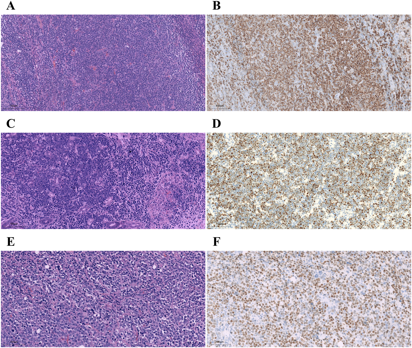 Slides were stained for IHC analysis using a Ventana BenchMark ULTRA (Ventana Medical System Inc., Tucson, AZ). The primary antibodies included BCL2, BCL6, and c-MYC (prediluted, ZSGB-BIO), and were visualized using enzyme peroxidase detection systems. Tonsil tissues served as positive controls. Two pathologists independently evaluated the slides after staining, and discrepancies were resolved by consensus review.