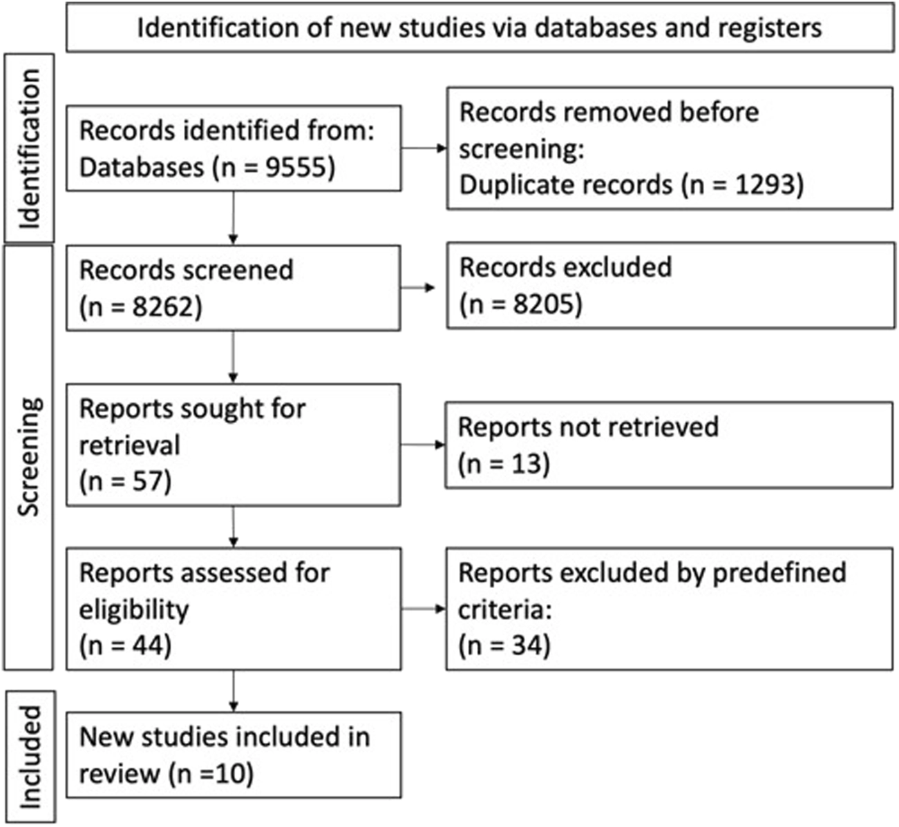 During the search process 9,555 articles were identified in the four databases and 8,262 articles remained after removal of duplicates. The selection steps by title, abstract and full text, further narrowed down the number of articles to 1,141 and 57. Finally, after the selection steps, 10 RCTs were included. Cohen’s Kappa was 0.61, which was a substantial agreement between the selection steps of the two authors.