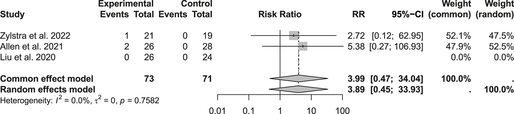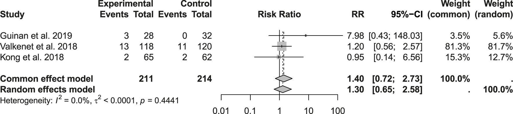 | Bleeding | 283 | RR: 1.38 (0.45–4.28) | 0.273 | Very low | No significant difference |