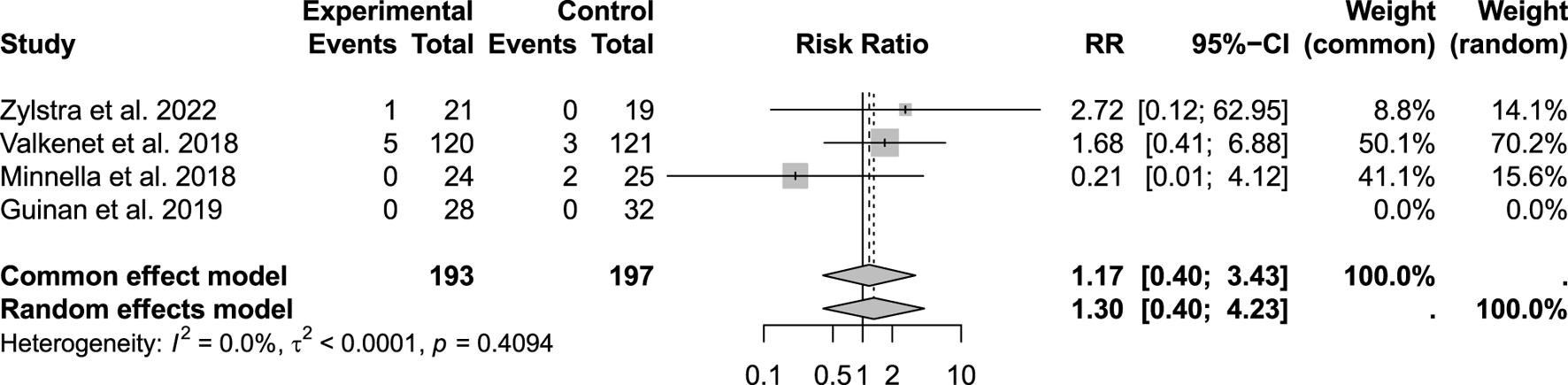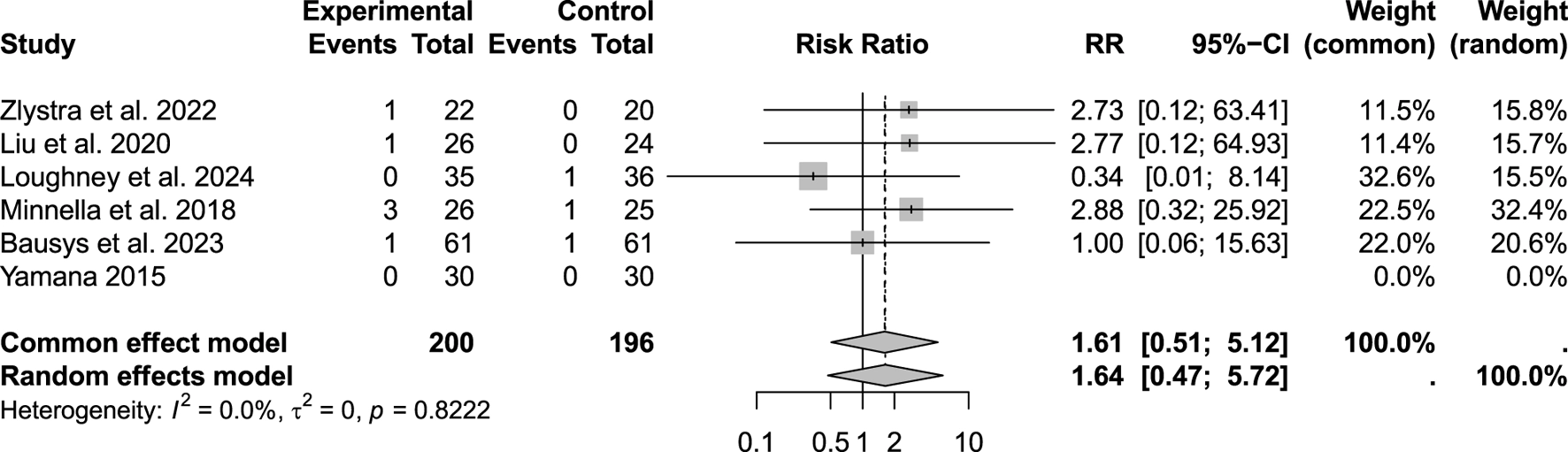 | Life-threatening complications (CD-IV) | 396 | RR: 1.61 (0.51–5.12) | 0.82 | Very low | No significant difference |