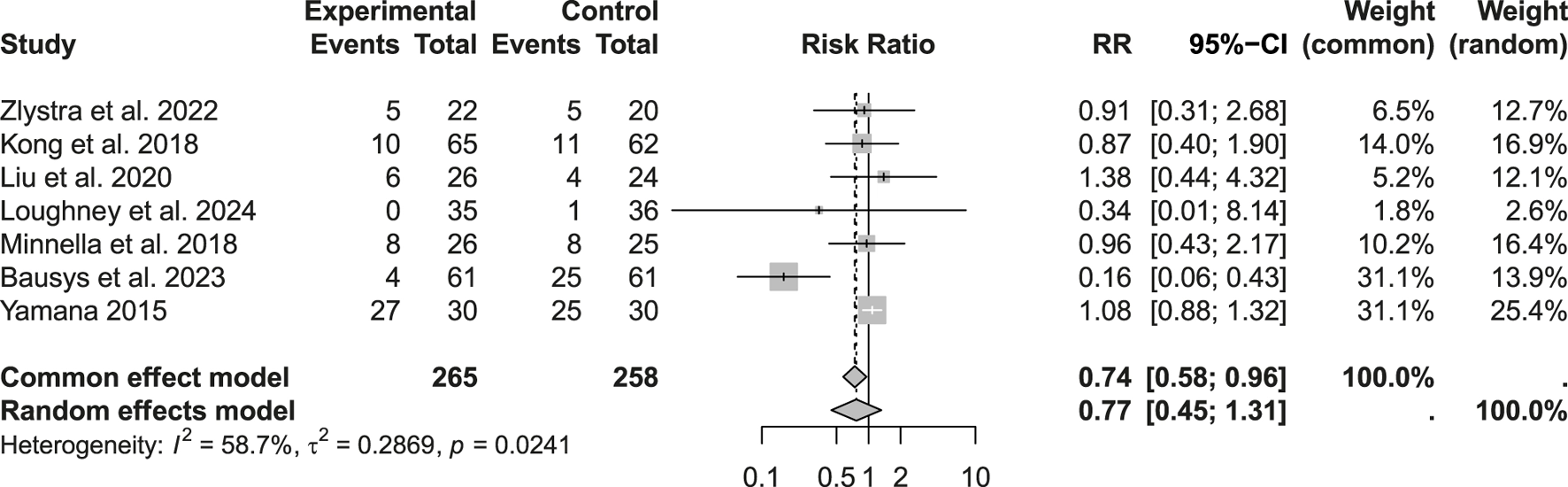Out of the 10 RCTs, 7 addressed tumor staging. Among these, 6 studies (total number of patients: 523; prehabilitation group: 295; control group: 228) analyzed T(0-)1–4 and N0–3 staging, while one study used the AJCC pathological tumor staging system. Only one study reported T0 stage, including 13 patients in the prehabilitation group and 12 patients in the control group. In the prehabilitation group, T1 stage was recorded in 54 patients, T2 in 53, T3 in 140, and T4 in 27 patients. In the control group, T1 stage was observed in 52 patients, T2 in 40, T3 in 150, and T4 in 27 patients. The AJCC pathological tumor staging system was applied in one study involving a total of 51 patients (prehabilitation group: 26; control group: 25). In the prehabilitation group, 6 patients were classified as stage I, 0 as stage II, and 18 as stage III. In the control group, 5 patients were stage I, 2 were stage II, and 18 were stage III.