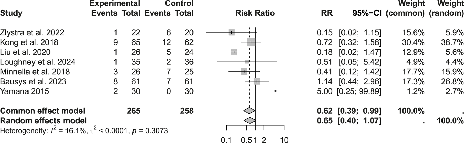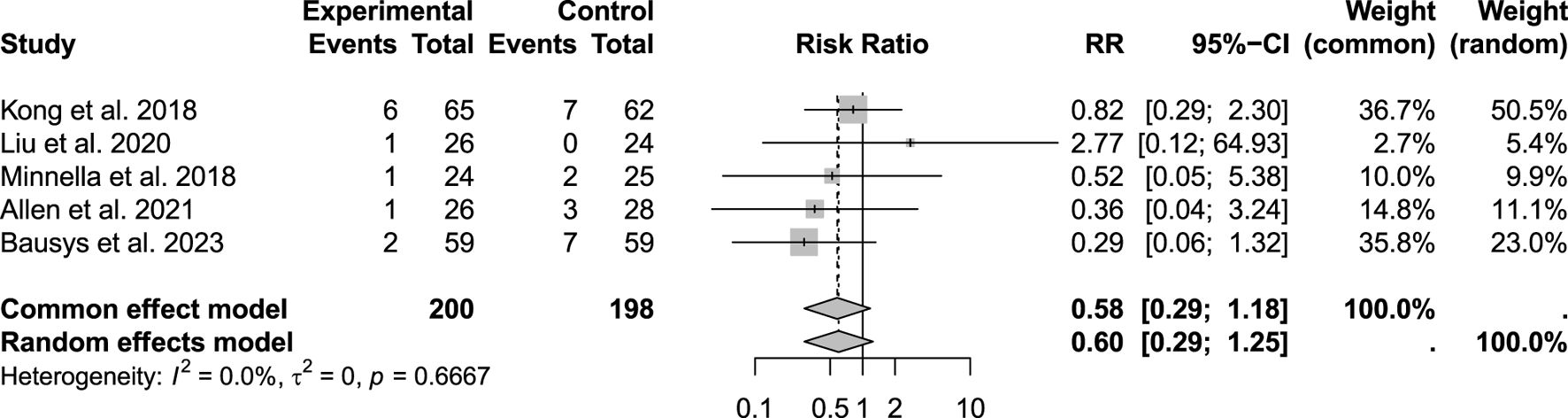 Examining minor postoperative complications, it was noted that similar findings were reported by Bausys et al. in their study, which included 61 patients in the intervention group and 61 in the control group. Their research analyzed complications such as wound infections, pulmonary complications, anastomotic insufficiency, anaemia requiring blood transfusion, intra-abdominal abscesses, pancreatic complications, postoperative bleeding, cardiovascular and neurological complications, duodenal stump leakage, anastomosis stenosis, and urinary tract infections. An analysis of complication severity revealed that minor complications (Clavien–Dindo grades I–II) occurred significantly less frequently in the prehabilitation group (6.8% compared to 42.4%, P = 0.001; RR 0.16, 0.05–0.43). While initial global assessments suggested no difference, a focused analysis of Grade III complications—which require surgical, endoscopic, or radiological intervention—revealed a significant reduction in the prehabilitation group when using a common effects model, consistent with the low heterogeneity observed for this outcome. (16.9% versus 18.6%, P = 0.810; RR 0.90, 0.41–1.97) [14].