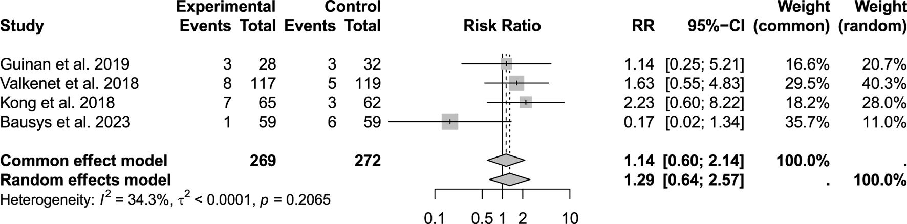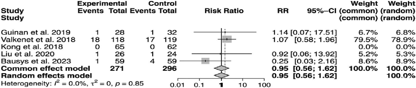 | Wound infection | 541 | RR: 1.14 (0.60–2.14) | 0.206 | Very low | No significant difference |