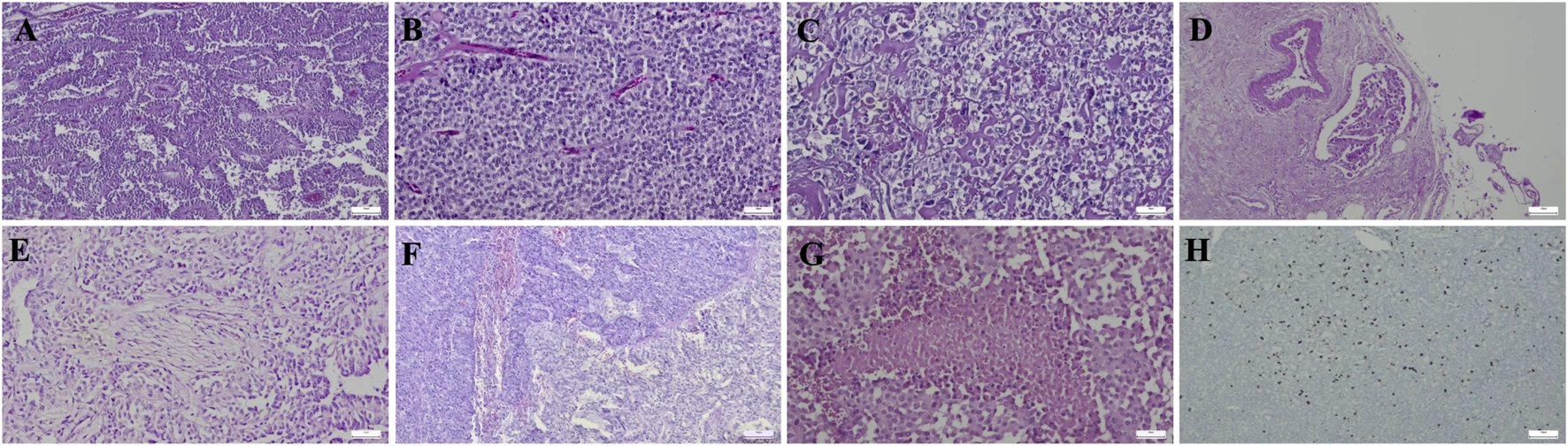 Formalin-fixed, paraffin-embedded and hematoxylin-eosin (H&E)-stained tumor samples were examined microscopically. Capsule integrity was variable due to the friable nature of the tumors, and sampling included at least one section per centimeter of tumor diameter, representative sections of the capsule and adjacent pancreatic parenchyma. Histopathological evaluation included assessment of mitotic activity, necrosis, lymphovascular invasion (LVI), perineural invasion (PNI), capsule and parenchymal infiltration, and cytological atypia.